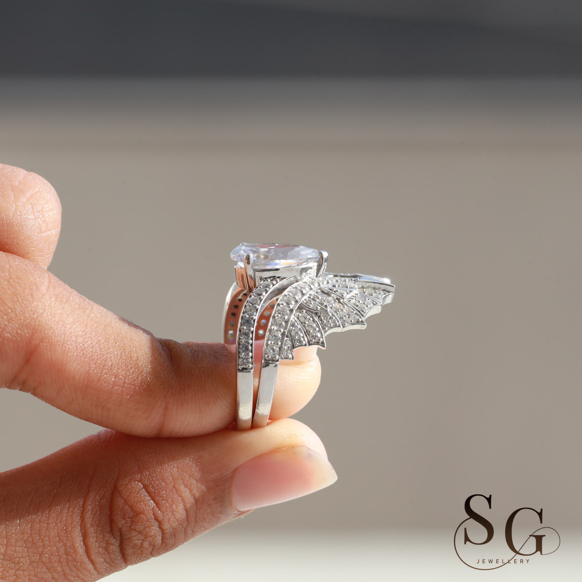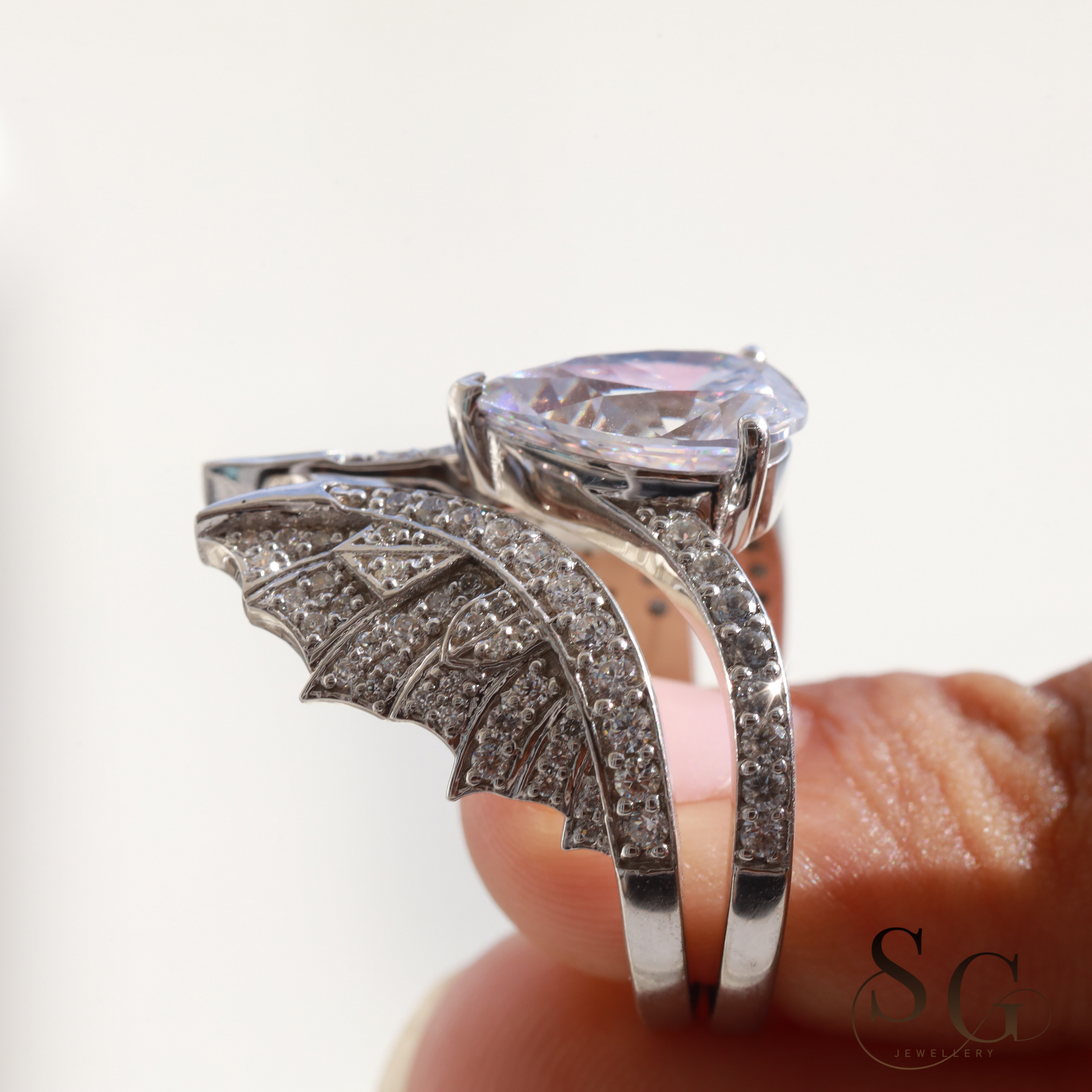 2-teiliges Brautset aus Weißgold im Birnenschliff mit im Labor gezüchteten Diamanten – Fledermausring