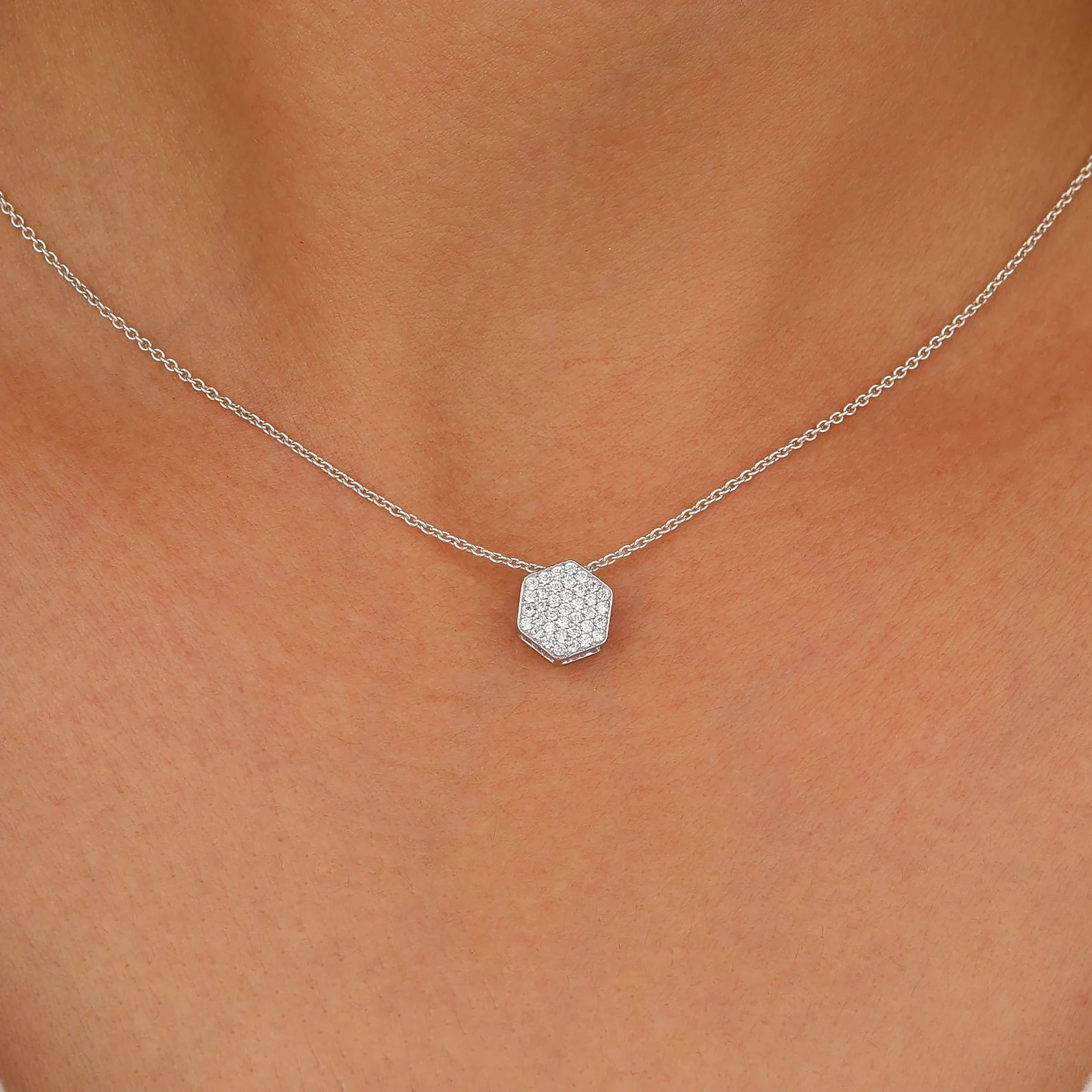 Ein klassischer Anhänger aus 14 Karat Weißgold mit einem sechseckigen, im Labor gezüchteten Diamanten – perfekt für den minimalistischen Look der modernen Frau. Diese Halskette mit im Labor gezüchteten Diamanten ist ein Must-have für Ihre Schmucksammlung. Dieser moderne und stilvolle Anhänger funkelt mit einem brillanten, ethisch gewonnenen, im Labor gezüchteten Diamanten. Er ist als konfliktfrei zertifiziert und verfügt über ein Echtheitszertifikat – eine Möglichkeit, Ihren Look ohne schlechtes Gewissen zu präsentieren.